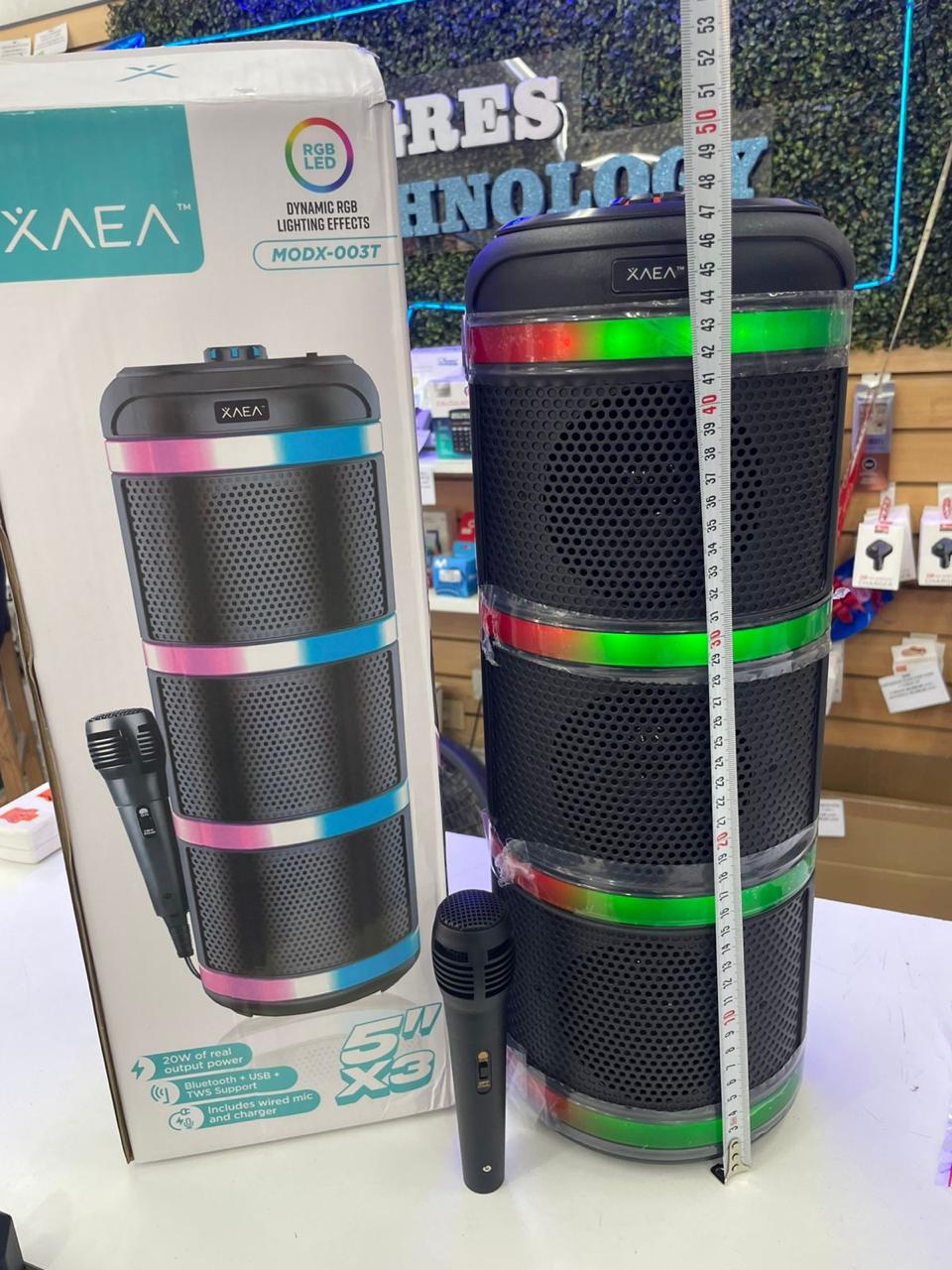 Incluye cable de carga y micrófono con cable para karaoke o presentaciones.