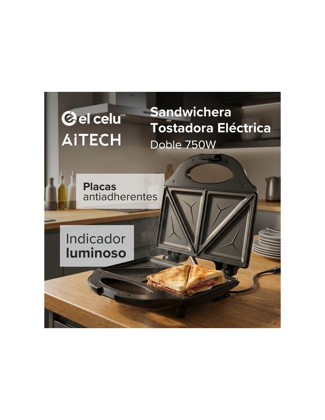 La Sandwichera Tostadora Eléctrica AiTECH es ideal para preparar tostados de manera simple y rápida. Con potencia de 750W, permite un calentamiento uniforme para lograr sandwiches dorados y crocantes.