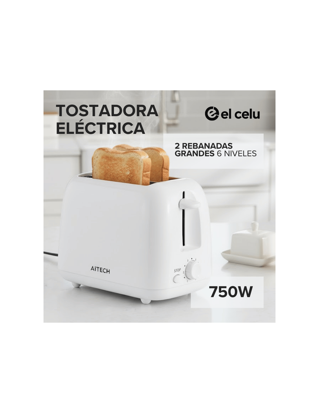 La Tostadora Eléctrica AITECH combina practicidad, eficiencia y un diseño moderno en color blanco que se adapta a cualquier cocina. Permite obtener tostadas uniformes y ajustadas al gusto, con funciones pensadas para facilitar el uso diario y la limpieza.